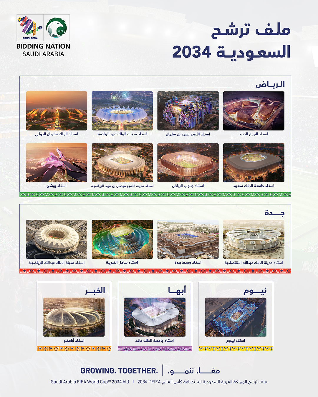 وقد قدمت المملكة ملف الترشح لإستضافة كأس العالم 2034 بشكل رسمي للفيفا في العاصمة الفرنسية باريس يوم الاثنين 29 يوليو2024 تحت شعار “معاً ننمو” .
