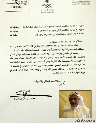 [JUSTIFY]تلقى مدير عام الشئون الصحية بمنطقة مكة المكرمة الدكتور عبدالسلام بن عبدالرحمن نور ولي خطاب شكر وتقدير من قبل معالي وزير الصحة الدكتور محمد بن علي ال هيازع عقب عدم ابداء رغبته في تمديد فترة تكليفه كمدير عام لمنطقة مكة المكرمة شكر معالية ” نور ولي ” باسمه ونيابة عن وزارة الصحة على الجهود الكبيره والمتميزة التي بذلها خلال فترة تكليفة والتي انعكست على تطوير مستوى الخدمات الصحية المقدمة والتي لمسها الجميع ، متمني ومقدر تلك الجهود مع تطلع معاليه الي الاستمرار من الاستفادة من خبراته ومشورته في العمل .الجدير بالذكر ان الدكتور عبدالسلام نور ولي تولي دفة القيادة في 22/3/1435 هـ تميز فيها بالعمل ضمن فرق تميزت بتقديم افضل الخدمات للمواطنين وحجاج بيت الله الحرام وزواره ، وعقب صدور موافقة معالي وزير الصحة شكر عدد من قيادي المنطقة ” نورولي ” على مابذله خلال فترة إدارته للمنطقة والتي تميزت بجديته وتفانيه ومتابعته الدائمة ، لتقديم افضل الخدمات الصحية لهذه البقعه المقدسة متمنين من الله العلي القدير ان يوفقه في حياته المقبلة ، ومباركين ومتمنين لمدير عام الشئون الصحية بمنطقة مكة المكرمة الدكتور عبدالله بن صالح المعلم التوفيق والنجاح المستمر .[/JUSTIFY]