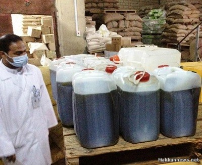 ضبط مفتشو الهيئة العامة للغذاء والدواء مستودعي أغذية في جدة والدمام تلاعبا بصلاحية أكثر من 2800 كيلو غرام من الزبيب و2000 لتر من الزيت.