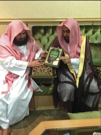 وفي ختام اللقاء اهداهم معاليه إصداره الجديدوهو السفر الثالث من كوكبة الخطب المنيفة من منبر الكعبة الشريفة