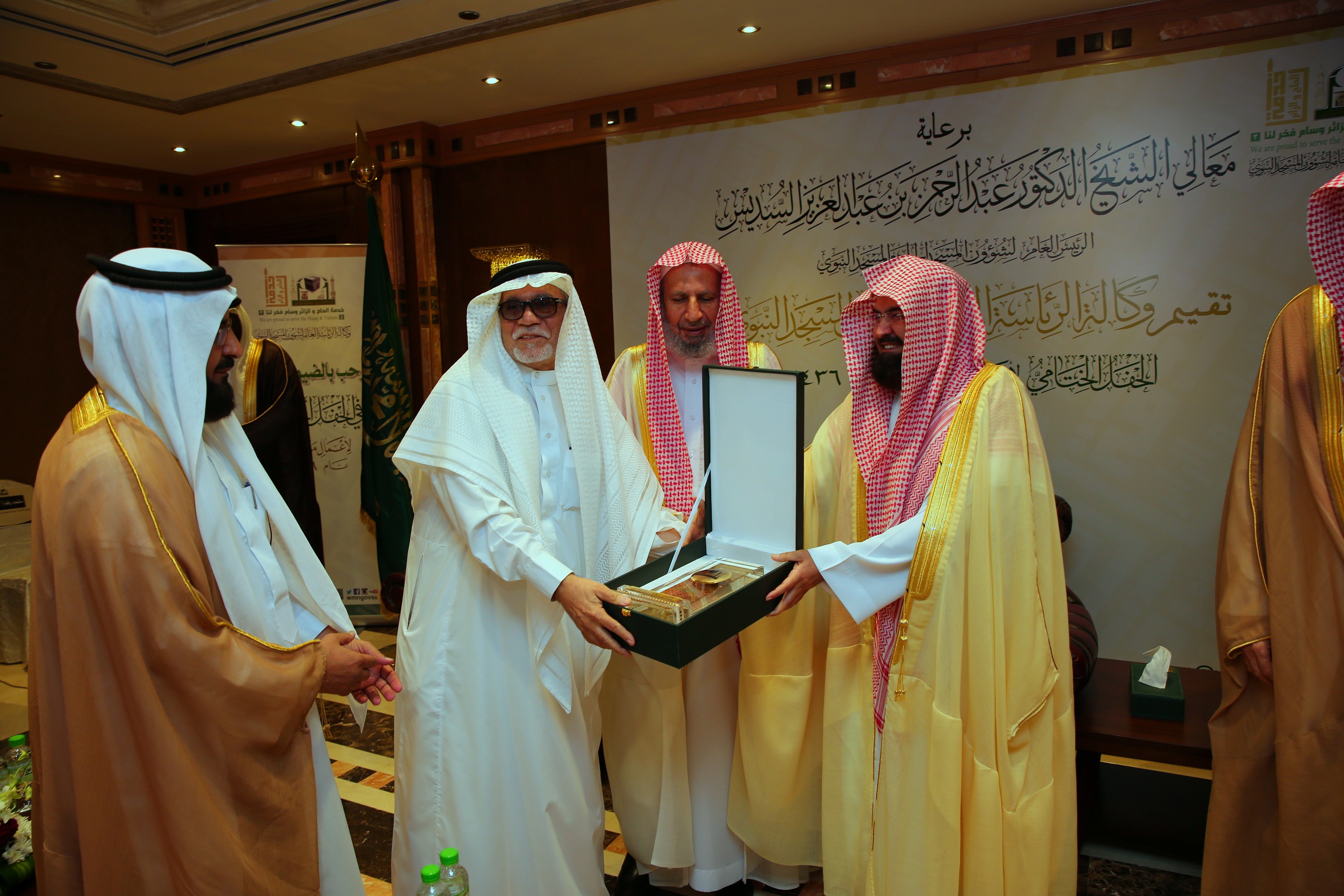 وتسلم فضيلته التكريم من معالي الشيخ الدكتور عبدالرحمن بن عبدالعزيز السديس و معالي الشيخ عبدالعزيز بن عبدالله الفالح نائب الرئيس العام لشؤون المسجد النبوي وفضيلة وكيل الرئيس العام لشؤون المسجد النبوي الدكتور علي بن سليمان العبيد .