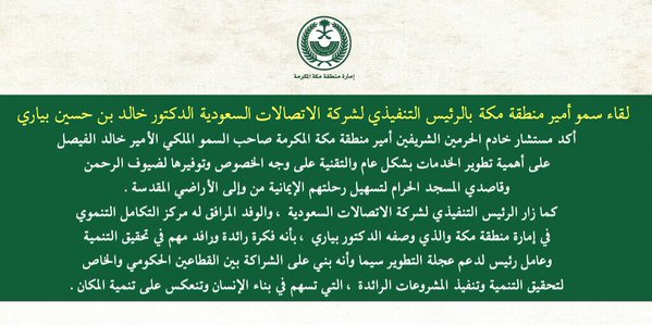 أكد صاحب السمو الملكي الأمير خالد الفيصل مستشار خادم الحرمين الشريفين أمير منطقة مكة المكرمة, على أهمية تطوير الخدمات بشكل عام والتقنية على وجه الخصوص وتوفيرها لضيوف الرحمن وقاصدي المسجد الحرام لتسهيل رحلتهم الإيمانية من وإلى الأراضي المقدسة .