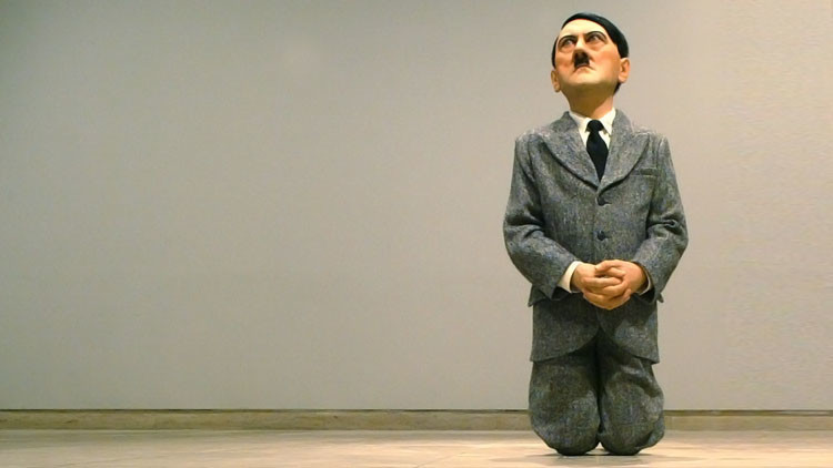 التمثال الذي يظهر فيه فوهرر النازية أدولف هتلر، القتيل في 1945 منتحراً بإشعال النار بنفسه، هو بحجم صبي جثا مضموم اليدين، ونظر إلى أعلى وهو مرتدٍ حلة رصاصية، ويبدو للناظر إليه من الخلف، وكأنه فتى يصلي، ولكن من الأمام يرى الناظر وجه الرجل الذي أشعل حرباً عالمية ثانية سقط فيها 59 مليوناً من القتلى، وضعفهم من الجرحى والمشوهين.