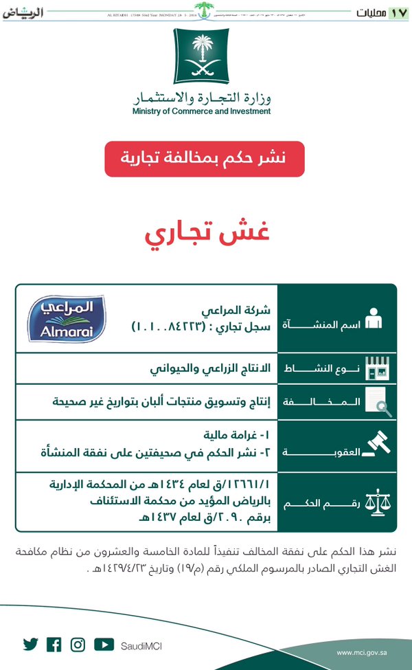 عاقبت وزارة التجارة والاستثمار شركة المراعي للانتاج الزراعي والحيواني بالغرامة المالية والنشر في صحيفتين بعد أن ادانت الوزار الشركة بإنتاج وتسويق منتجات ألبان بتواريخ غير صحيحة ، صدر القرار بعد أن أدانت المحكمة الإدارية بالرياض الشركة بالمخالفات المشار إليها وبعد صدور حكم مؤيد من محكمة الاستئناف وهما الحكمين برقم 1/1266/ق لعام 1434هـ والحكم رقم 2090/ق لعام 1437هـفي هذا الصدد.