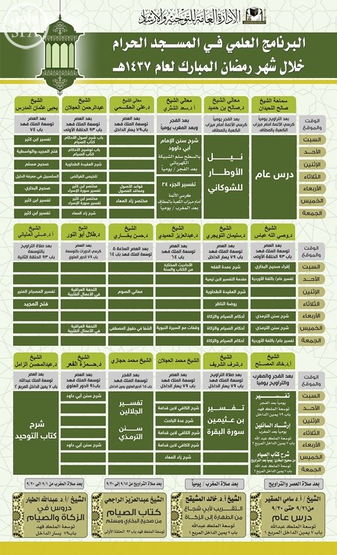 أعلنت الرئاسة العامة لشؤون المسجد الحرام والمسجد النبوي ممثلة في إدارة التوجيه والإرشاد عن جدول الدروس العلمية لموسم رمضان المبارك بالمسجد الحرام لعام ١٤٣٧هـ , التي تحرص الرئاسة من خلالها على توعية وتثقيف قاصدي الحرمين الشريفين ,