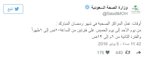 حددت وزارة الصحة، مواعيد الدوام الرسمي للمراكز الصحية خلال شهر رمضان، وذكرت في تغريدة لها على تويتر: “أوقات عمل المراكز الصحية في شهر رمضان المبارك: من يوم الأحد إلى يوم الخميس على فترتين من الساعة ١٠ صباحاً إلى ١ ظهراً والفترة الثانية من ٩ مساءً إلى ١٢صباحاً”.