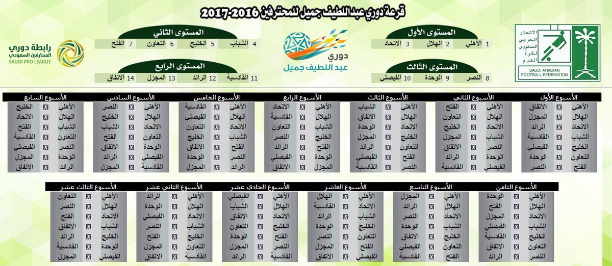 قسمت أندية دوري عبداللطيف جميل للمحترفين إلى أربعة مستويات قبل إجراء قرعة الدوري المحترفين للموسم المقبل 2016-1، حيث جاء التقسيم بحسب ترتيب الأندية في الموسم الماضي، فالمستوى الأول الأهلي والهلال والاتحاد، والمستوى الثاني: التعاون والفتح والشباب والخليج، والمستوى الثالث: النصر والوحدة والفيصلي، والمستوى الرابع: القادسية والرائد والمجزل والاتفاق.