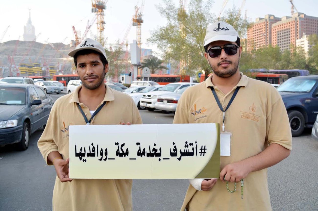 ويتقلد زميله طلال الغامدي من نشاط إرشاد التائه لافتة كتب عليها ” أتشرف بخدمة مكة ووافديها ” ويقوا ” ليست من باب المباهاة أو لغرض إعلامي ؛ مكة التي جعلها الله مثابة للناس وأمنا ، وجعل أفئدة الناس تهوي إليها ؛ حين توفق لخدمتها ويختارك الله لهذه المهمة تدرك حينها معنى التشرف بالخدمة “.