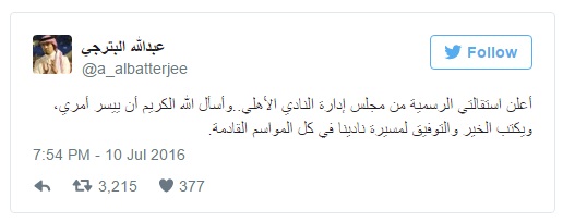 أعلن نائب رئيس مجلس إدارة النادي الأهلي عبدالله بترجي يوم الأحد عبر حسابه في موقع التواصل الإجتماعي “تويتر” استقالته من منصبه .