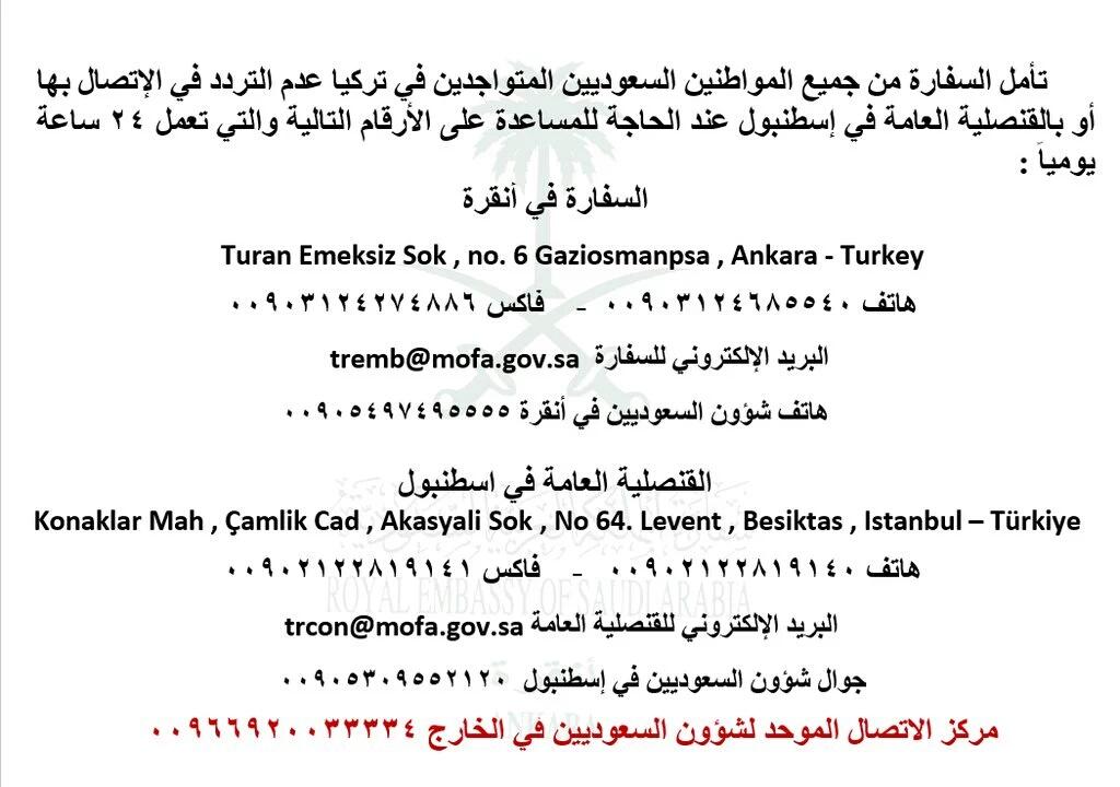 طالبت سفارة المملكة في تركيا المواطنين السعوديين المتواجدين في تركيا بأخذ الحيطة والحذر والابتعاد عن أماكن التجمعات والتواصل عند الحاجة للمساعدة مع مسؤول شؤون السعوديين مباشرة.