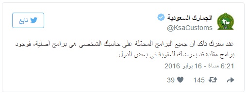 حذرت الجمارك السعودية المسافرين الحاملين لأجهزة الحاسي الآلي من وجود برامج مقلدة وغير أصلية في الأجهزة التي يحملونها أثناء السفر، مؤكدة أن بعض الدول تعاقب على هذا الأمر، وذكرت في تغريدة عبر حاسبها الرسمي: “عند سفرك تأكد أن جميع البرامج المحمّلة على حاسبك الشخصي هي برامج أصلية، فوجود برامج مقلدة قد يعرضك للعقوبة في بعض الدول”.