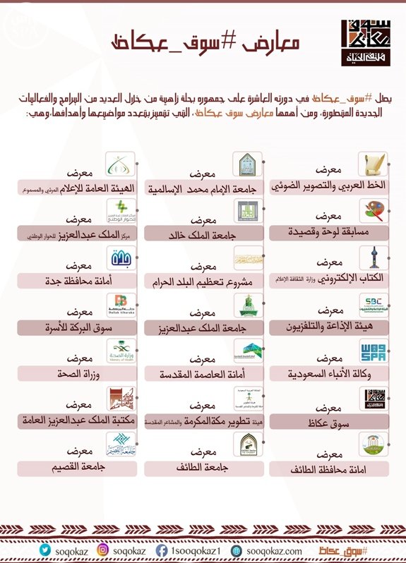 خصص سوق عكاظ في دورته العاشرة التي تنطلق الثلاثاء المقبل 5 آلاف متر مربع لأكثر من 20 مؤسسة ثقافية وتعليمية وتنموية ستشارك بمعارض تعنى بالثقافة والتاريخ والعلوم في موقع واحد يحتضن بداخله أحدث المعلومات والفنون التي ستقدم بهوية السوق .