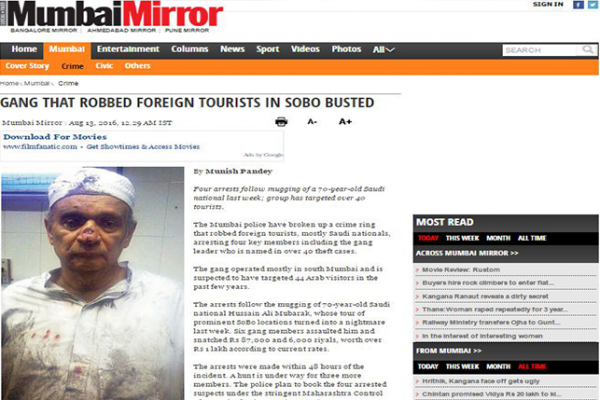 جاء حادث تعرض سبعيني سعودي لحادث سطو في مدينة مومباي الهندية ليمكن الشرطة من القبض على عصابة هندية تخصصت في سرقة السائحين العرب والسعوديين على وجه الخصوص، كما قامت الشرطة بضبط زعيم العصابة الذي تمكن من السطو على أكثر من 44 سائحا عربيا خلال الأعوام القليلة الماضية.