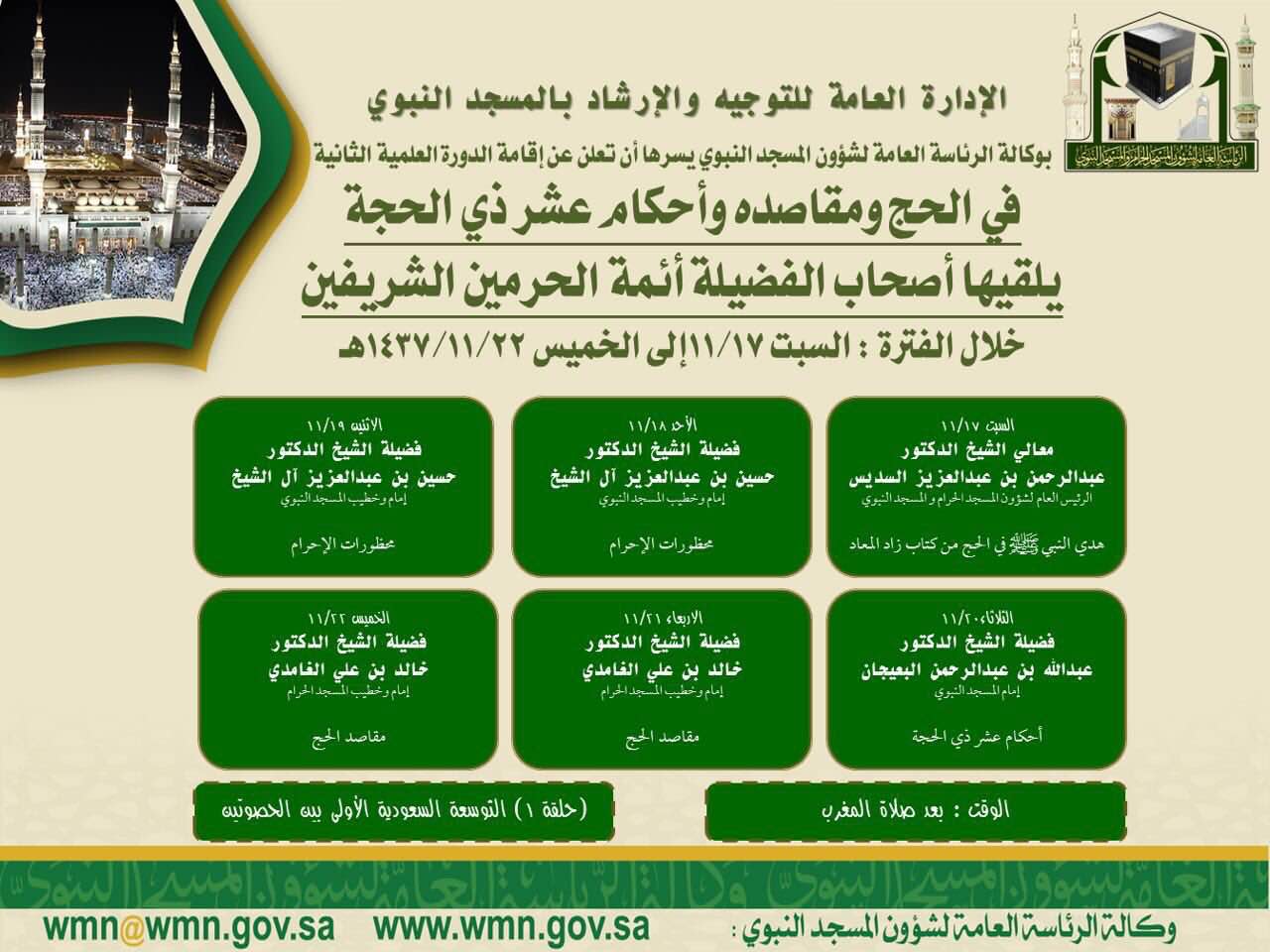 تنظم وكالة الرئاسة العامة لشئون المسجد النبوي ممثلة بإدارة التوجيه والإرشاد اليوم، الدورة العلمية الثانية في الحج ومقاصده وأحكام عشر ذي الحجة ، وذلك انطلاقاً من رسالة الحرمين الشريفين العلمية والدعوية ، التي يلقيها أصحاب الفضيلة أئمة الحرمين الشريفين بالمسجد النبوي لستة أيام في الحلقة رقم 1 بالتوسعة السعودية الأولى بين الحصوتين .