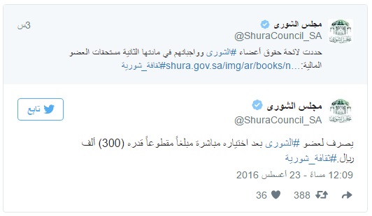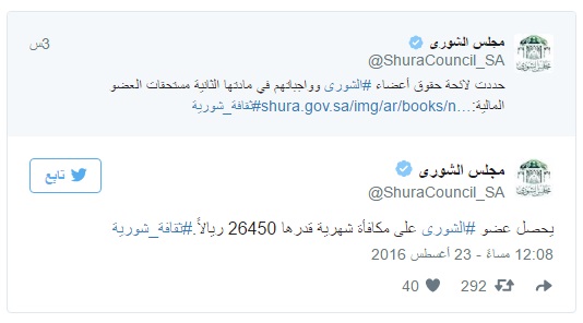 طرح مجلس الشورى اليوم لائحة ونظام “المجلس” عبر حسابه الرسمي على “تويتر”. حيث بث عدة تغريدات توضيحية عن مستحقات الأعضاء المالية كحصول كل عضو على مكافأة شهرية قدرها (26.450) ريالا. إضافة إلى منحه مبلغا مقطوعا قدره (300.000) ريال بعد تعيينه مباشرة.
