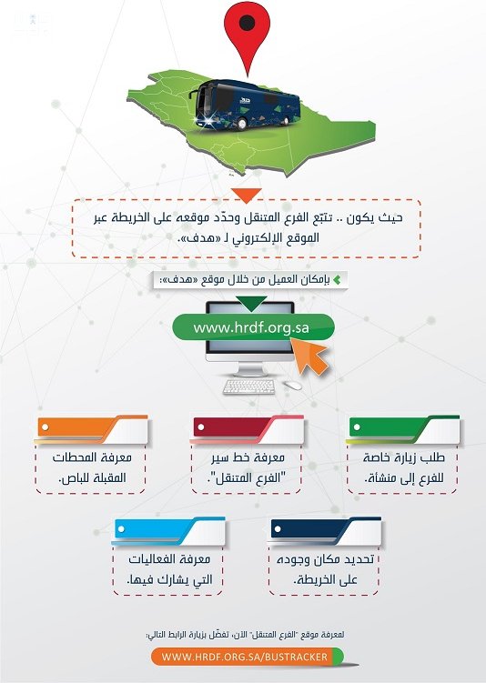 أطلق صندوق تنمية الموارد البشرية “هدف” صفحة إلكترونية خاصة بفرعه المتنقل (https://www.hrdf.org.sa/BusTracker)، تتيع لعملاء الصندوق تتبّع أماكن وجوده في مختلف مناطق المملكة، التي سيشارك فيها في الفترة المقبلة.
