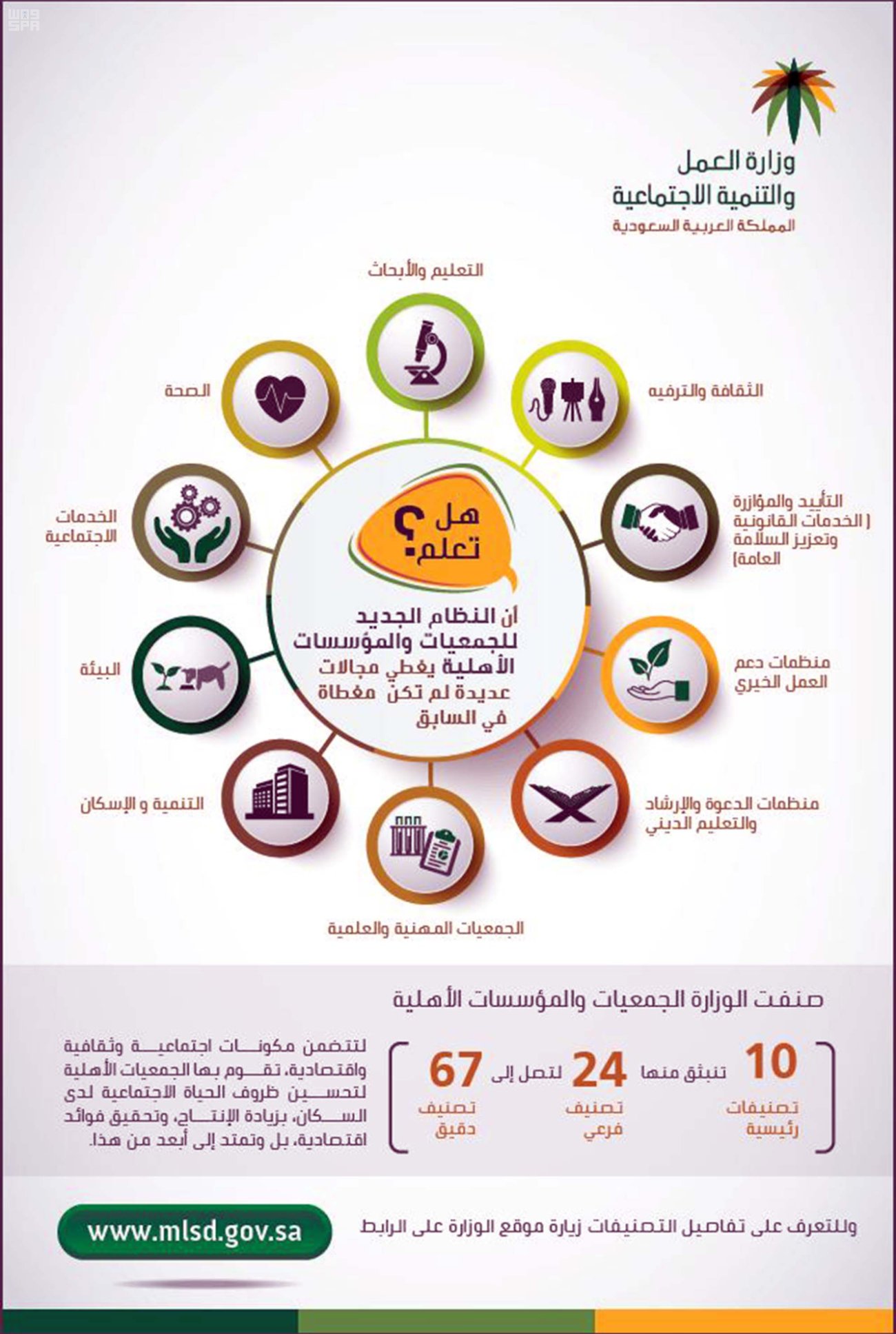 أكدت وزارة العمل والتنمية الاجتماعية، أن نظام الجمعيات والمؤسسات الأهلية الجديد يسمح بإنشاء جمعيات ومؤسسات وفقاً لـ 10 تصنيفات رئيسية متفرعة لأنشطة عديدة، و24 تصنيفاً فرعياً، و67 تصنيفاً دقيقاً، تتنوع ما بين رياضية وثقافية وعلمية وإرشادية وبيئية، لتغطي بذلك مجالات عديدة لم تكن مغطاة في السابق.