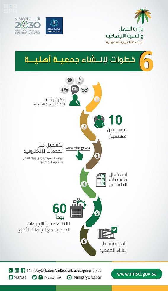يسّرت وزارة العمل والتنمية الاجتماعية، إجراءات تأسيس الجمعيات الأهلية، لتكون عبر 6 خطوات ميسرة، سعياً منها لتحقيق مزيد من المرونة في انطلاق الجمعيات، لتعميق أثرها التنموي نحو تمكين الفرد وتشجيعه على تحقيق أهدافها التي أنشئت من أجلها؛ بما يتناسب مع متطلبات الواقع والمستجدات الحالية والمستقبلية.