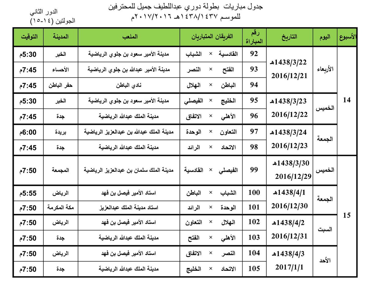 أصدرت لجنة المسابقات بالاتحاد السعودي لكرة القدم، جدول مواعيد مباريات جولتي 14 و15 مندوري جميل، والتي تنطلق يوم الأربعاء 21 ديسمبر المقبل.