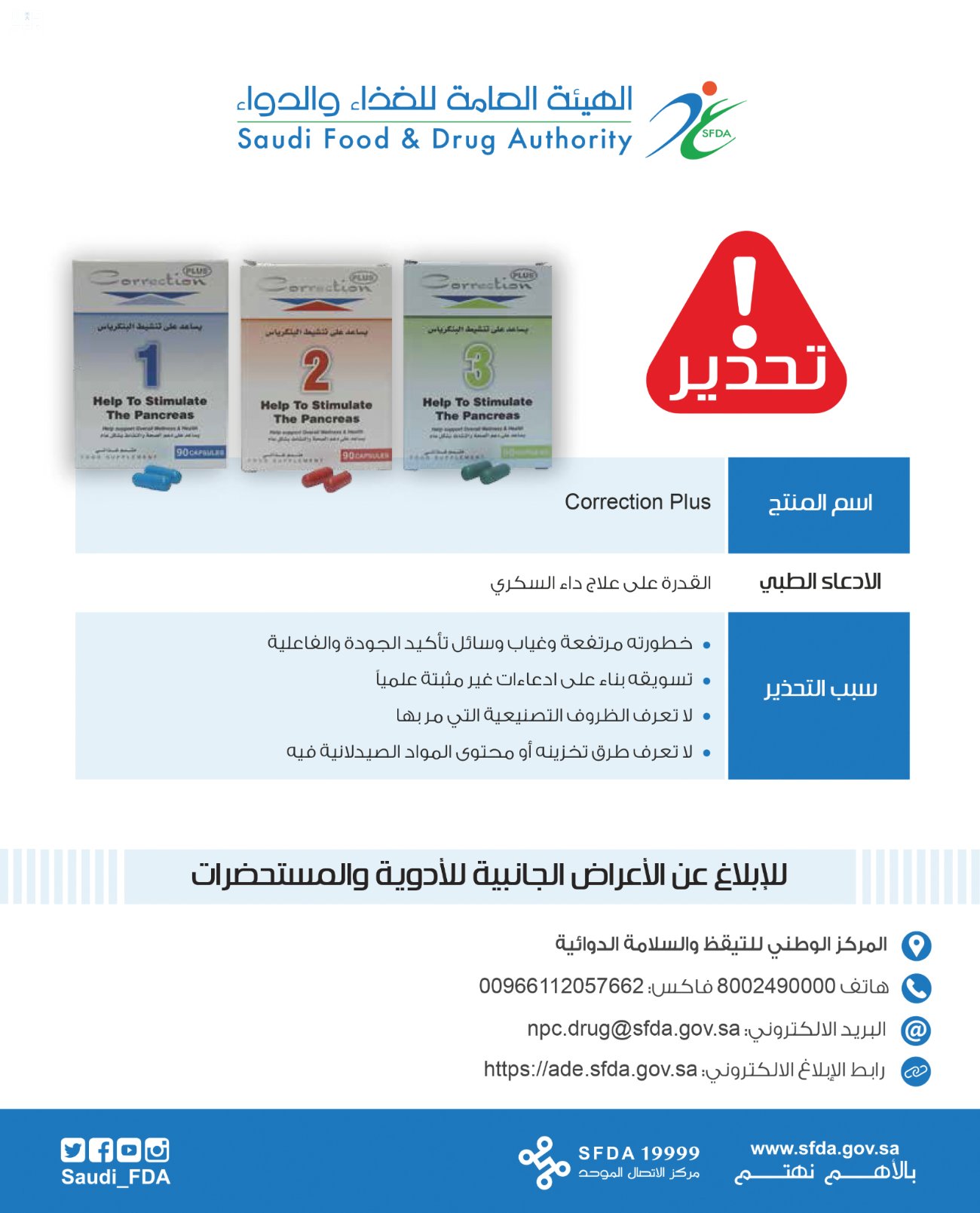 حذرت الهيئة العامة للغذاء والدواء من مستحضر (Correction Plus)، الذي يسوق عبر أحد المواقع الالكترونية على أنه يعالج مرض السكري، في حين أنه يحتوي على إدعاءات طبية مخالفة.