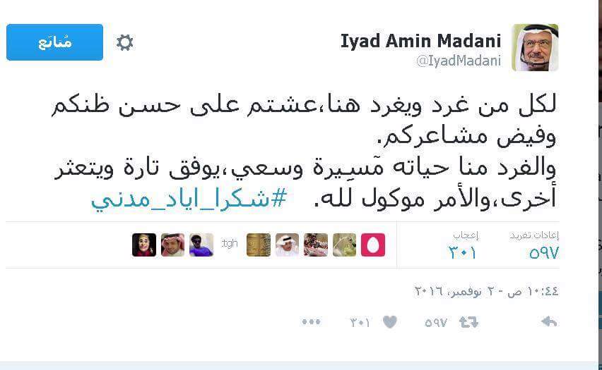 وقال مدني، في مشاركة عبر “تويتر”: لكل من غرد ويغرد هنا، عشتم على حسن ظنكم وفيض مشاعركم، والفرد منا حياته سِيرة وسعي، يوفق تارة ويتعثر أخرى ، والأمر موكول لله.