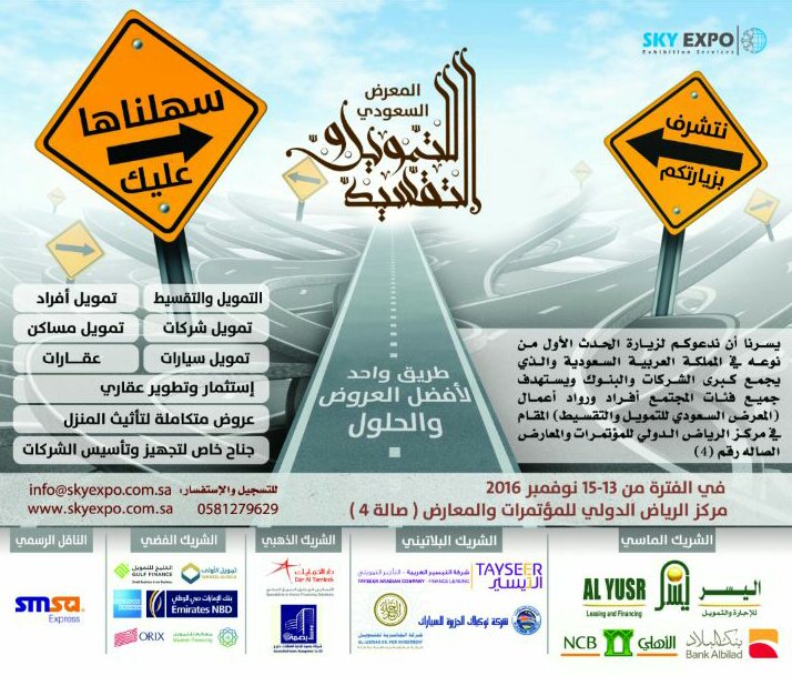 تنظم شركة سكاي اكسبو الشركة الرائدة في مجال تنظيم و تجهيز المعارض والمؤتمرات “المعرض السعودي للتمويل والتقسيط “وهو المعرض الأول في المملكة للتمويل والتقسيط الذي يدعم الأفراد ورواد الأعمال وأصحاب المنشأت الصغيرة والمتوسطة إنطلاقاً من رؤية 2030 .