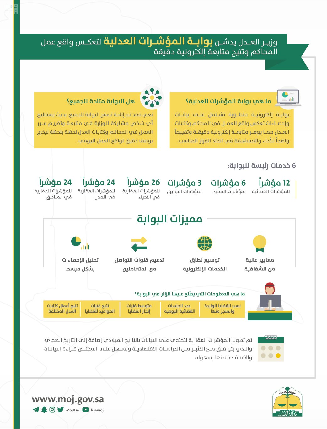 وتهدف الوزارة من خلال تدشينها بوابة المؤشرات العدلية على الرابط الإلكتروني https://www.moj.gov.sa/ar/bi ،إلى مشاركة المهتمين والمستفيدين في متابعة وتقييم حجم القضايا الواردة والمنجز منها في المحاكم وكتابات العدل بشكل يومي، بعد منح المستفيدين من خدماتها صلاحية الاطلاع على حجم العمل اليومي، ومعرفة عدد الجلسات ومتوسط الفترات لإنجاز القضية، إلى جانب تتبع تباعد فترات المواعيد الجديدة للقضايا، تأكيداً لمبدأ الشفافية ولنشر البيانات العدلية المفيدة للجهات البحثية والمختصين.