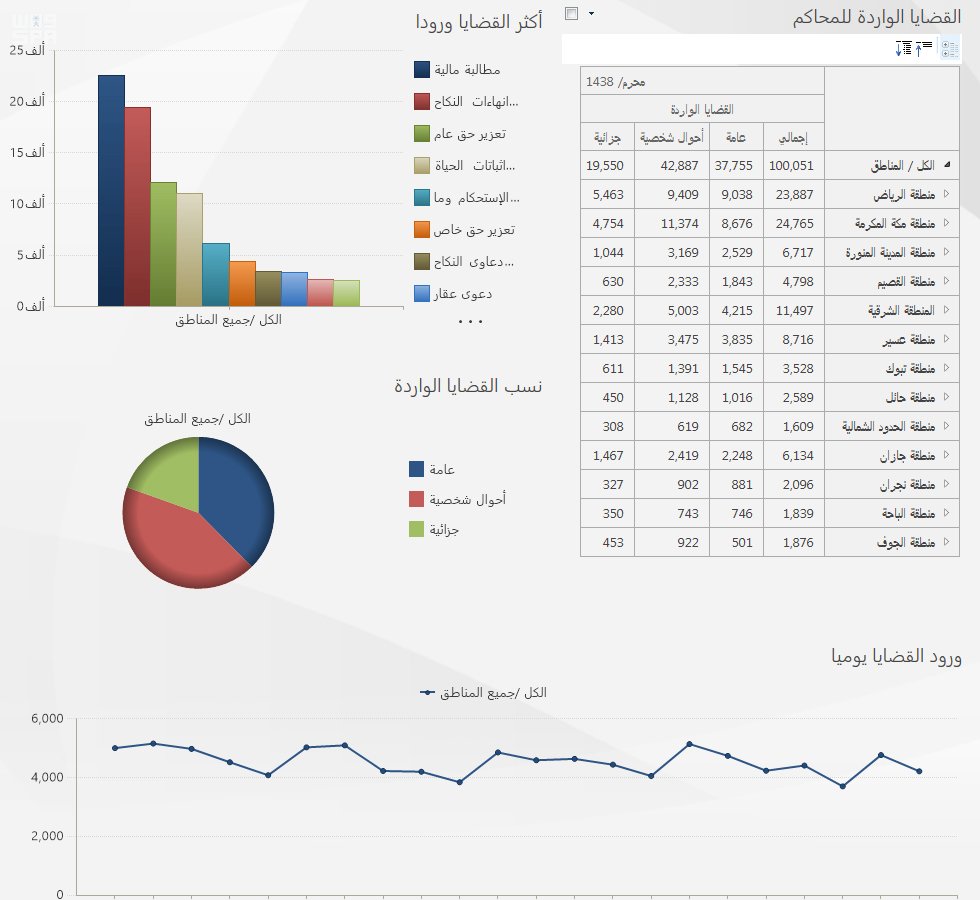 وبخصوص المؤشرات القضائية فقد احتوت على 3 أقسام رئيسة تمثل : القضايا الواردة، والقضايا المنتهية، والمواعيد المسجلة، كما أطلقت المؤشرات العدلية الخاصة بمحاكم التنفيذ، حيث قسمتها إلى قسمين رئيسيين، وهي الطلبات الواردة والطلبات المنتهية، التي يمكن من خلالها تتبع واقع طلبات التنفيذ التي ترد لمحاكم التنفيذ وتزايدها اليومي ونسب الإنجاز فيها بكل سهولة خلال فترات معينة، إضافة إلى عرض المبالغ المنجزة بحسب أنواع وسندات التنفيذ المختلفة.