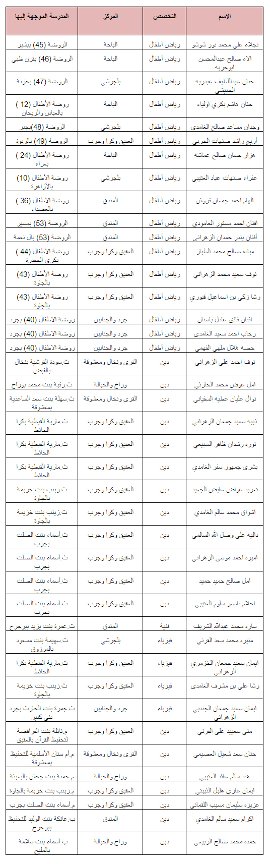 اعتمد المدير العام للتعليم بمنطقة الباحة الأستاذ سعيد بن محمد مخايش حركة توجيه المعلمات المعينات إلى مدارس المنطقة والبالغ عددهم ” 41 ” معلمة بمختلف التخصصات التربوية و العلمية .