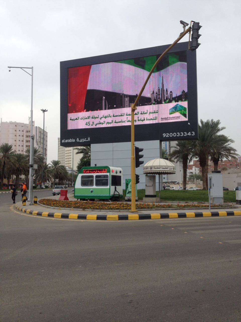 من جهته قال الاستاذ إيهاب بن جميل الرفاعي مدير عام تنمية ومراقبة الايرادات البلدية ، إن الامانة وبالتعاون مع الشركة العربية للدعاية والاعلان حرصت على المشاركة في في هذه المناسبة الوطنية لدولة الامارات الشقيقة ، إنطلاقا من عمق العلاقات الوطيدة التي تربط البلدين ، حيث تم بث اعلان التهنئة في كافة الشاشات الالكترونية بالشوارع والميادين العامة بمكة المكرمة وعلى مدار يوما كاملا ، مع اختيار عدد من العبارات والصور التي تبرز العلاقات الأخوية بين البلدين والشعبين الشقيقين ، والتي يسعى الجميع لتعزيزها وتنميتها في المجالات كافة.