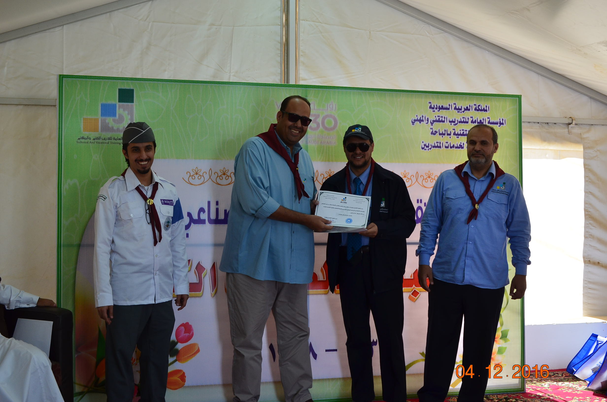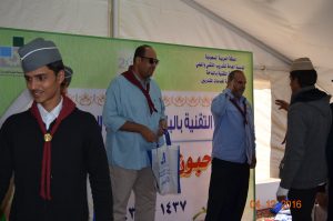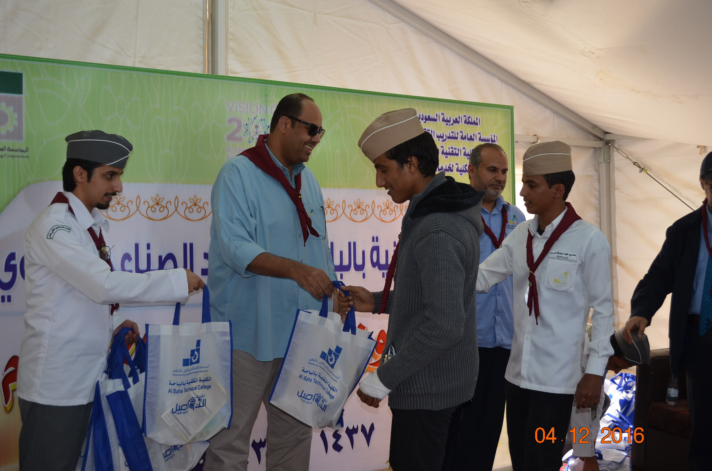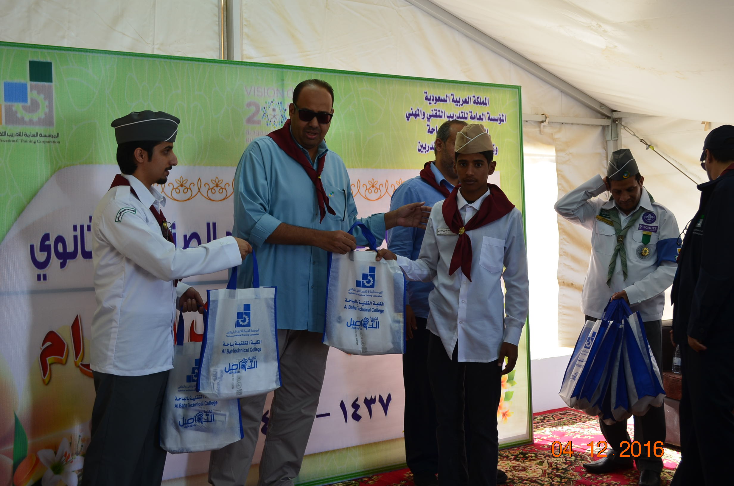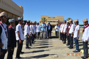 وفي نهاية المعسكر سلم سعادة عميد الكلية التقنية لبس الكشافة والمناديل للمتدربين كما كرم المشاركين في