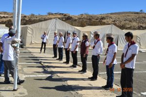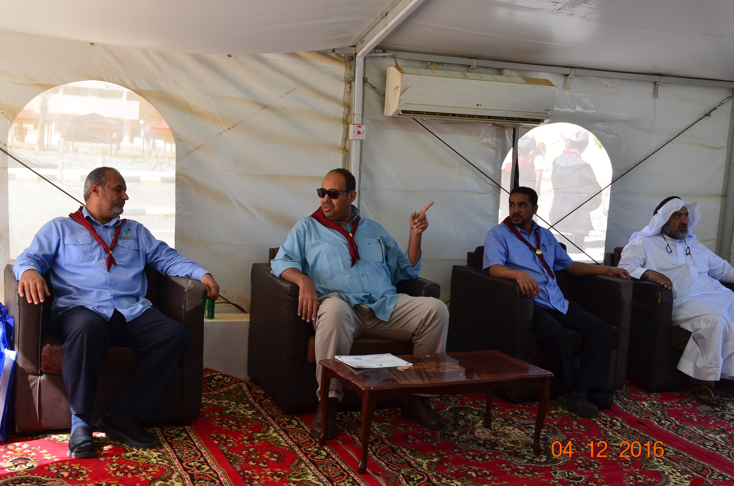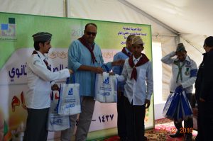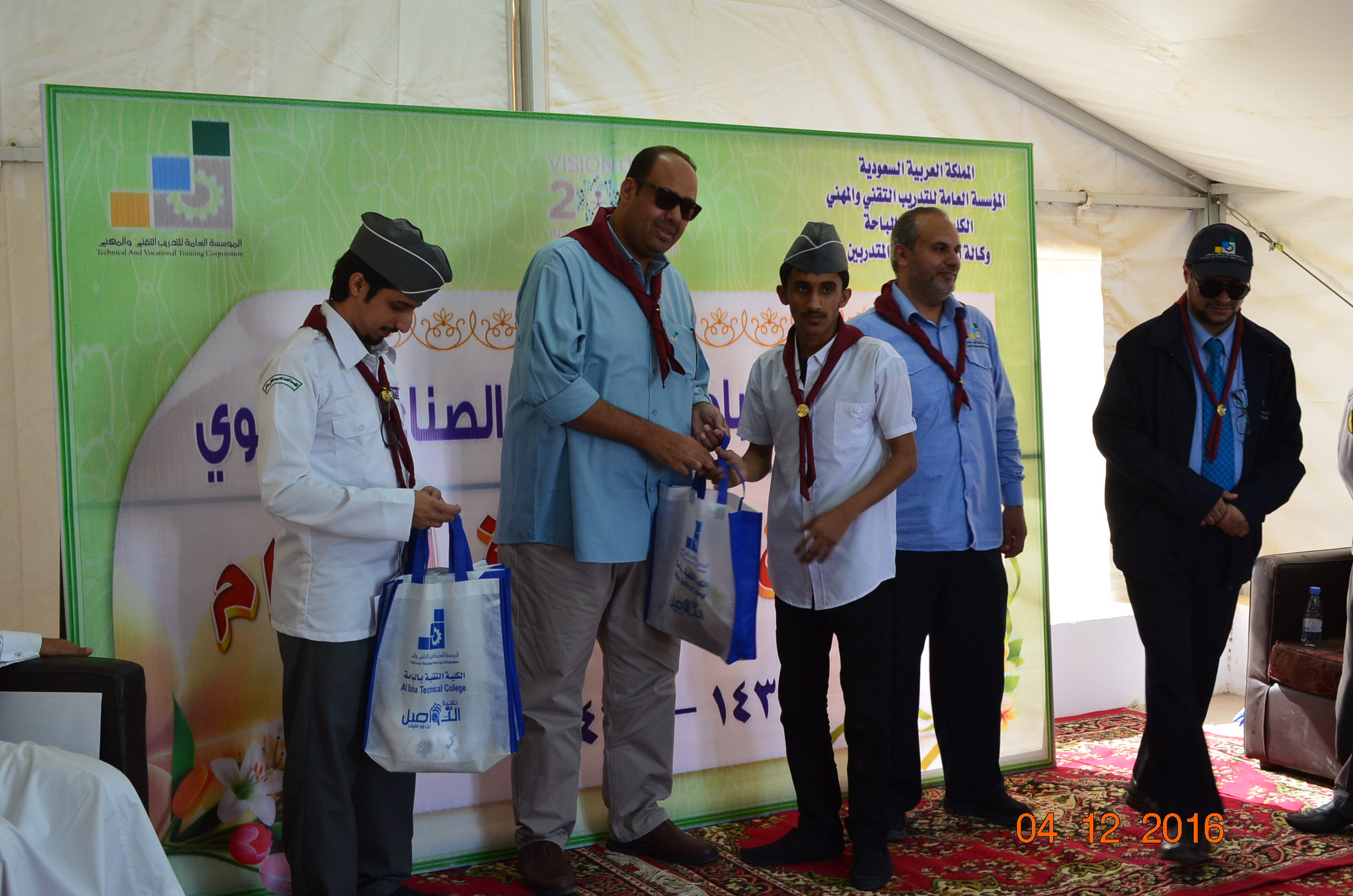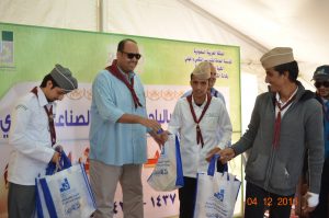 وفي نهاية المعسكر سلم سعادة عميد الكلية التقنية لبس الكشافة والمناديل للمتدربين كما كرم المشاركين في