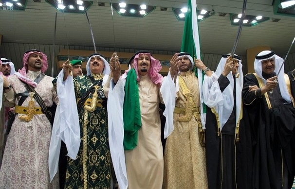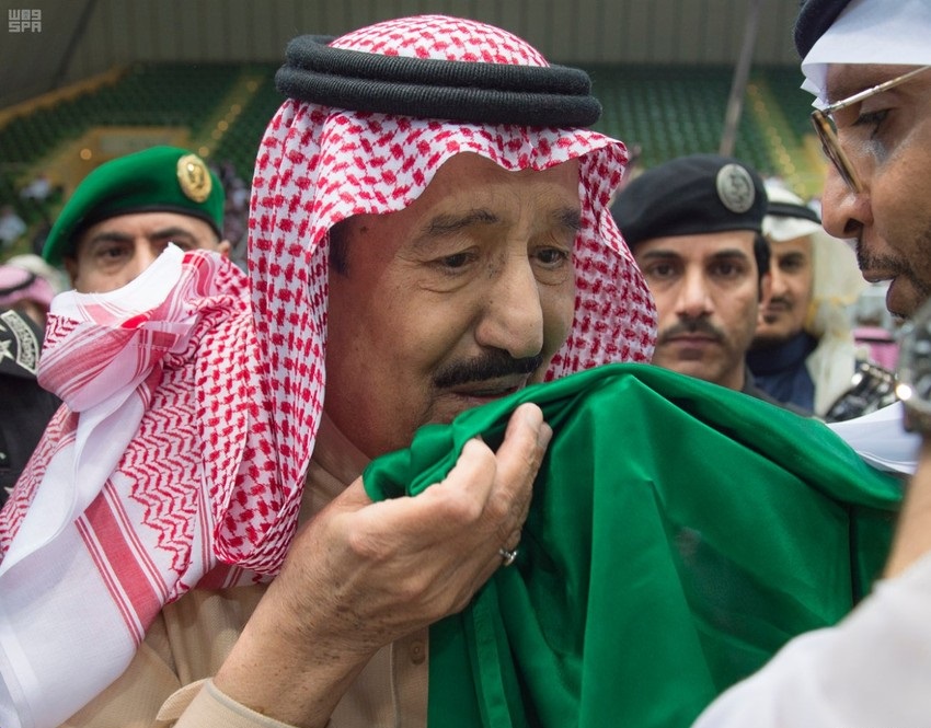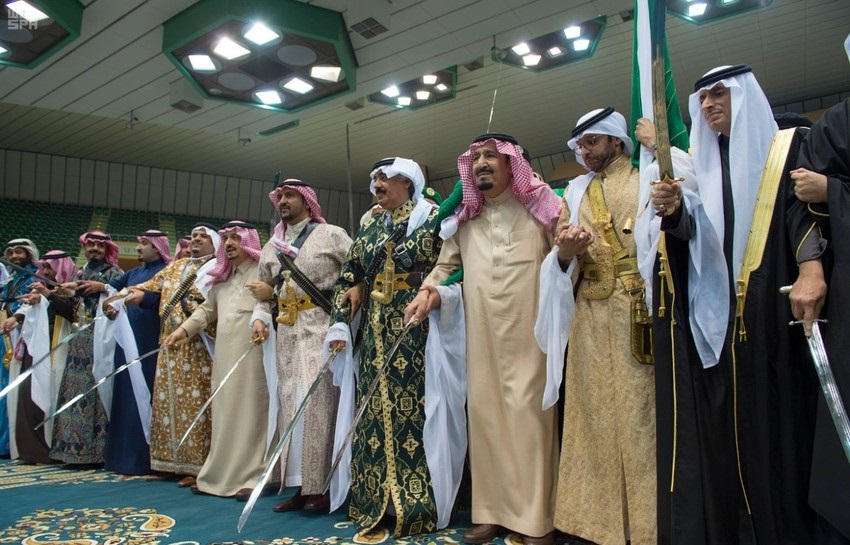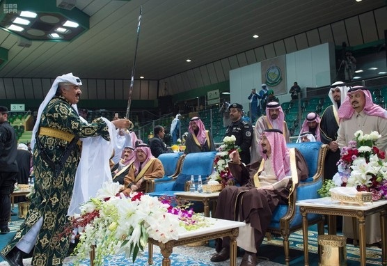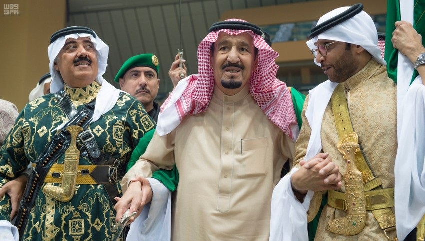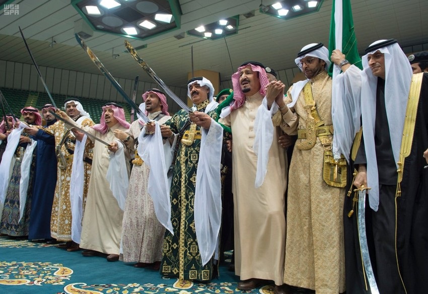 وبعد أن أخذ خادم الحرمين الشريفين الملك سلمان بن عبدالعزيز آل سعود مكانه في المنصة الرئيسة للاحتفال بدأت العرضة السعودية.