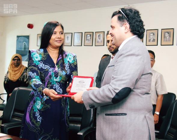 دشنت وزيرة التربية والتعليم بجمهورية المالديف الدكتورة عائشة شهام أمس ، توزيع المقررات الدراسية في اللغة العربية التي قدمتها المملكة العربية السعودية دعماً للتوسع الذي تنتهجه جمهورية المالديف في تعليم اللغة العربية وتعلمها ، وذلك بحضور نائب سفير خادم الحرمين الشريفين لدى جمهورية المالديف مترك الدوسري ، والمشرف العام على البعثة التعليمية في المالديف الدكتور محمد الغامدي.