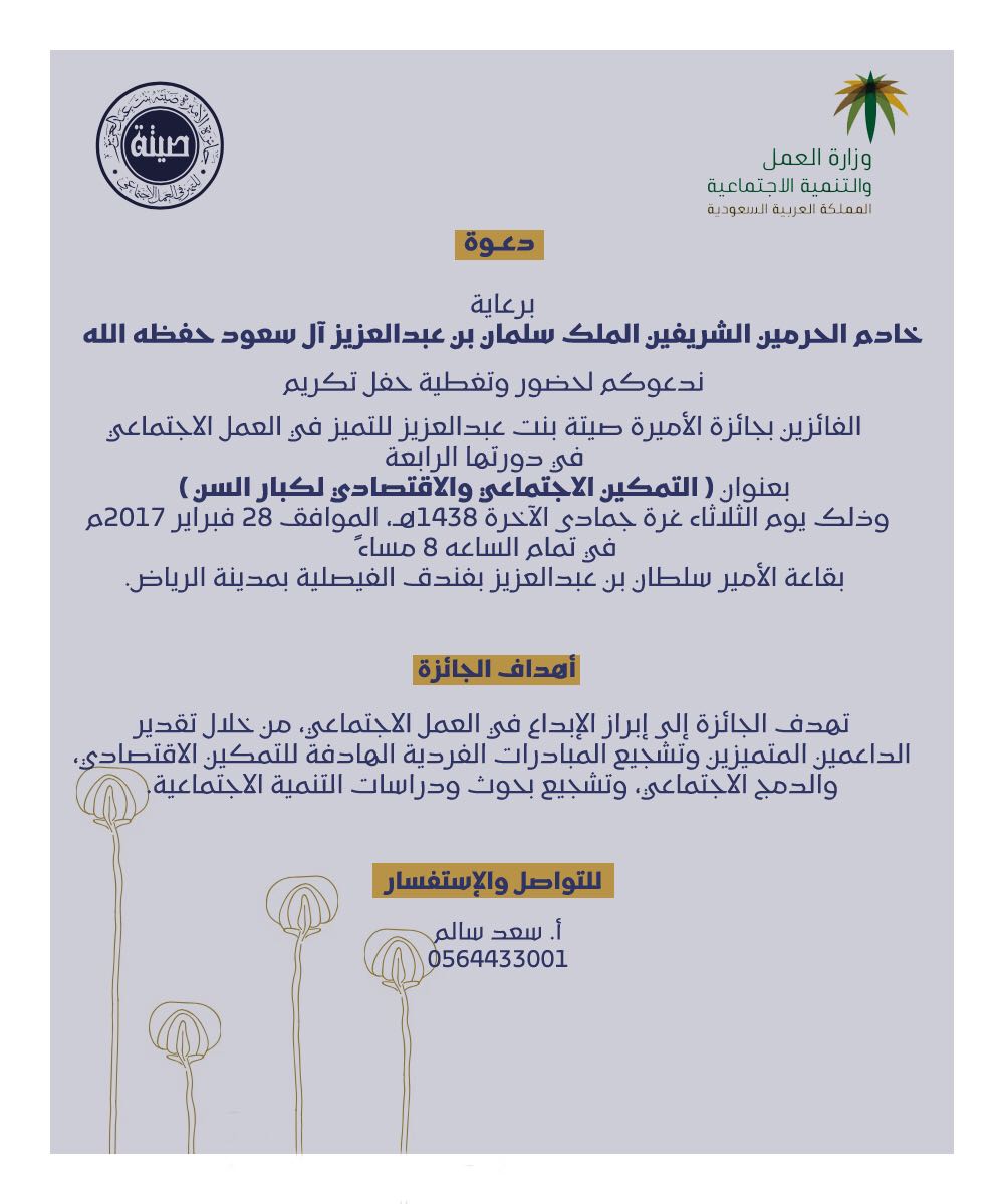 تحت رعاية خادم الحرمين الشريفين الملك سلمان بن عبد العزيز آل سعود ـ حفظه الله ــ، وبحضور أكثر من 700 شخصية من أصحاب السمو الأمراء وكبار المسؤولين والمهتمين بالعمل الخيري، يتوج معالي وزير العمل والتنمية الاجتماعية رئيس مجلس أمناء مؤسسة جائزة الأميرة صيتة بنت عبد العزيز للتميز في العمل الاجتماعي الدكتور علي بن ناصر الغفيص، غداً (الثلاثاء) في الرياض الفائزين السبعة بجائزة الأميرة صيتة للتميز في العمل الاجتماعي.