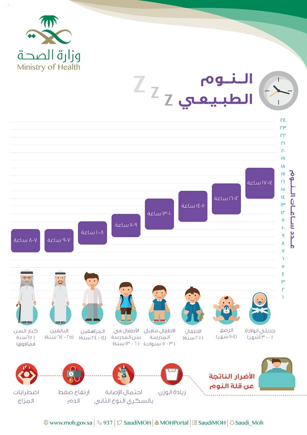 ونشرت الوزارة على حسابها الرسمي في تويتر إنفوجرافيك توعوي يتضمن تعريفاً بعدد ساعات النوم اليومية التي يحتاجها الإنسان عبر مراحل العمر بدءً من حديثي الولادة وحتى كبار السن, مبينة أن (النوم )يُعرف بأنّه حالة طبيعيّة تساعد عضلات الجسم على الاسترخاء، إذ تقلّ أثنائه الحركات الإراديّة، والشعور بالمحيط، ويعد نوعاً من أنواع تغيّر الوعي وليس فقدانه، وهو ظاهرة طبيعيّة تتم بشكل دوري لتنشيط الدماغ، والعمليات الحيويّة التي تحدث في جسم الإنسان.