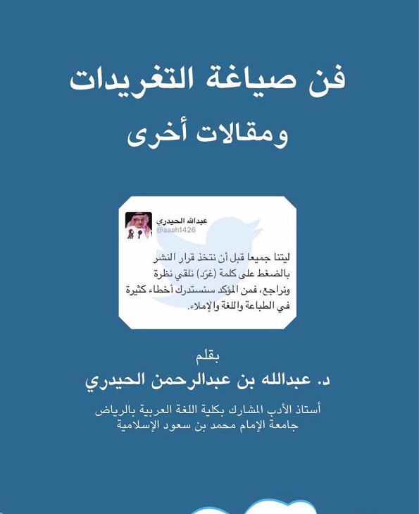 صدر كتاب ” فن صياغة التغريدات ” متزامناً مع انطلاق معرض الرياض الدولي للكتاب 2017م ، حيث يقع في مئة وإحدى وعشرين صفحة ، للمؤلف الدكتور عبدالله بن عبدالرحمن الحيدري أستاذ الأدب والنقد المشارك بكلية اللغة العربية بالرياض ، ورئيس النادي الأدبي بالرياض ، يتكون من مقدمة ، كشف فيها منهجه في اختيار المقالات .