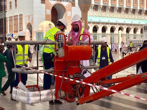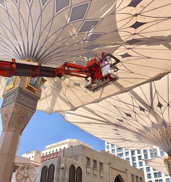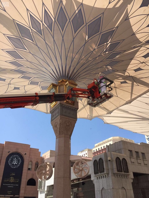 تفقد معالي الرئيس العام لشئون المسجد الحرام والمسجد النبوي الشيخ الدكتور عبدالرحمن بن عبدالعزيز السديس اليوم المظلات بساحات المسجد النبوي.