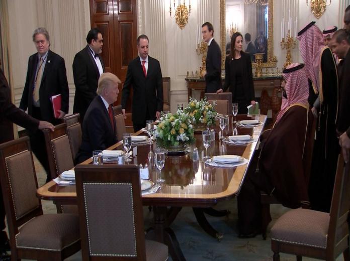 وأضافت الصحيفة: كان اللقاء مخططاً له أن يكون قصيراً، وفجأة تحول اللقاء إلى غداء عمل، حضره كبار القادة في البيت الأبيض، بينهم نائب الرئيس الأمريكي مايك بنس، وبحسب الصحيفة كانت مأدبة الغداء هي محاولة مبكرة من قبل الرئيس الأمريكي دونالد ترامب للتعامل مع المملكة، حيث هناك الآمال مرتفعة بعد وصول الرئيس الجمهوري الجديد إلى البيت الأبيض، خصوصاً وأن التواترات كانت قائمة مع الإدارة الأمريكية السابقة؛ بسبب الاتفاق النووي مع إيران.