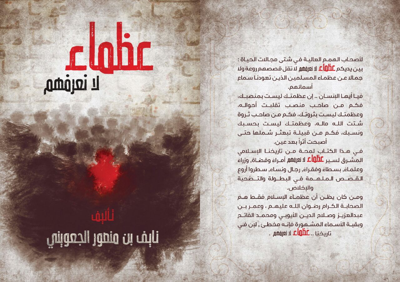 وقع الاستاذ نايف بن منصور الجعويني كتابه “عظماء لا نعرفهم” في معرض الرياض للكتاب الدولي 2017م. ذكر في كتابه عشرات من عظماء الاسلام لم ينصفهم التاريخ الذين ندثر ذكرهم أو لم تشتهر سيرتهم, مجاهدون وصابرون وأصحاب همم, واخرون ضربوا أروع صور التضحية والتفاني والاخلاص. شارك الحضور فرحة الكاتب، وأدلى كل واحدا بدلوه, وباركوا له عمله المتميز. ونبذه بسيطة عن المؤلف، ولد في الرياض من مواليد 1973م أكمل دراسته الابتدائي والمتوسطة والثانوية والجامعية في الرياض ، برز في رياضة السنوكر منذ بداية عام 1990 “بداية معرفتي به ومشاركته في نفس اللعبة” فاكتسح بطولة الرياض والمملكة لسنوات متتالية وفاز بألقاب خليجية وبرز عربيا كأسم لامع في هذا المجال الا انه توقف فجأة في عام 2002 ثم بدأ مشواره في لعبة البلياردو عام 2004م واكتسح بطولات الرياض والمملكة وأيضا حقق لقب بطولة الخليج والعرب ويكاد يكون من أبرز اللاعبين العرب على الإطلاق خاصتا بعد وصولة لدور قبل النهائي ببطولة العالم للمحترفين وكانت في الفجيرة الا ان المشوار توقف بعد ذلك بوقت قصير اثر خلافات حصلت بينه وبين الاتحاد السعودي للعبة كما ترك اللعبة معه عدد كبير من لاعبين المنتخب دفعة واحدة ومن أبرزهم اللاعب يوسف الوادي بطل الخليج , وعلى اثر اللقاء التلفزيوني الشهير مع نايف في قناة روتانا توقف نايف عن الرياضة وبعدها بسنين قليلة ظهر كناشط في وسائل التواصل الاجتماعي وبعدها ألف كتاب عظماء لا نعرفهم ولقي الكتاب صدى ونجاح واسع. ويعتبر الكتاب خلاصة للقرائته واطلاعه وحبه للكتب السيرة وشغفه في تقديم ما اندثر من تارخ لعظماء كثير غفل عنهم. ومن تميز مادة الكتاب نفدت الطبعة الاولى بعد مضي ثلاثة ايام من نزوله للمكتبات.