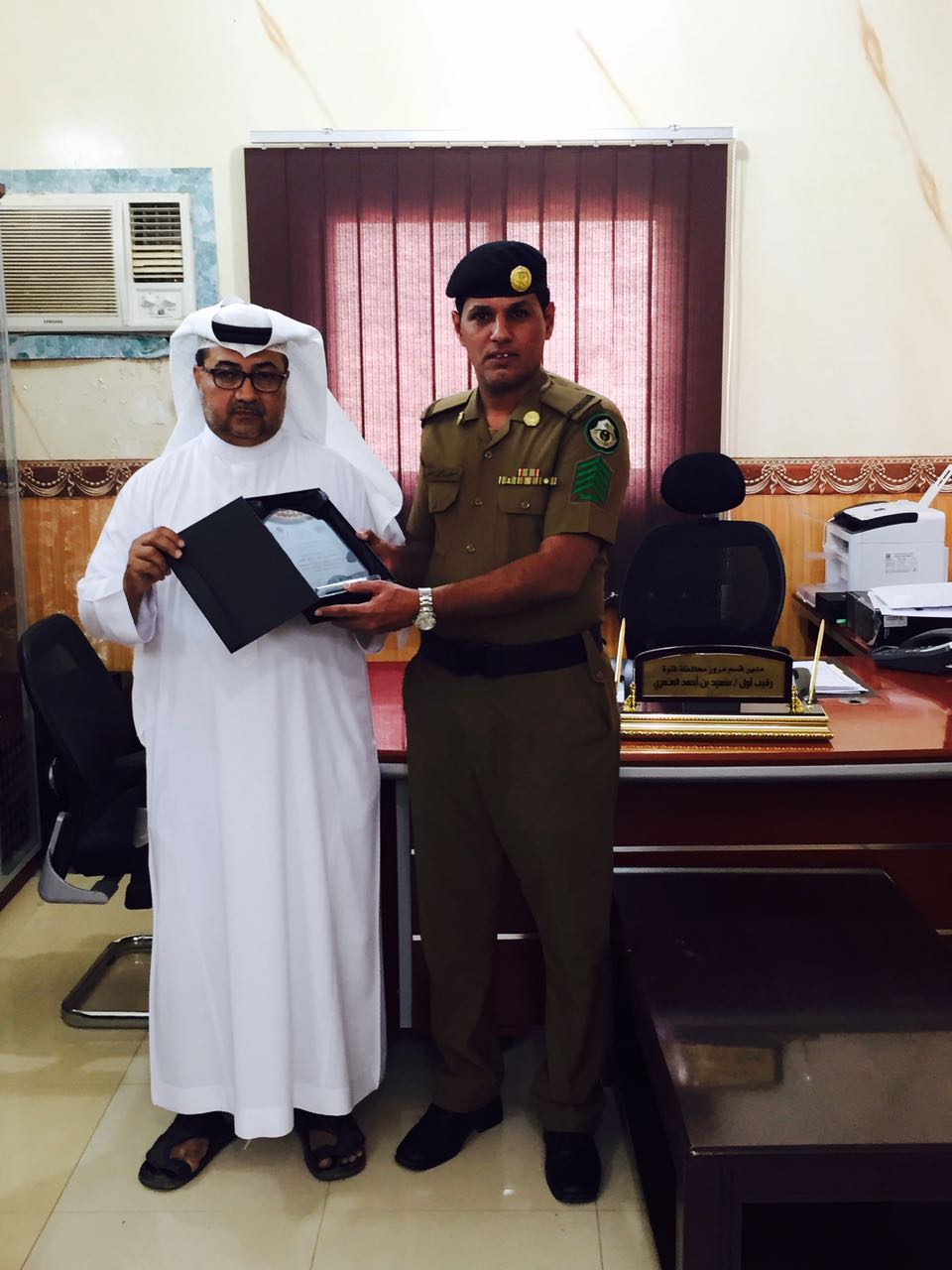 نيابة عن سعادة مدير إدارة مرور منطقة الباحة العقيد . حسين بن احمد مبارك . كرم مدير قسم مرور محافظة قلوة الرقيب اول . سعيد بن احمد العمري . مسؤول التحرير بصحيفة مكة الالكترونية بالباحة الزميل . حسن الصغير . لقاء جهوده ومشاركته في نشر التوعية المرورية خلال اسبوع المروري الخليجي الموحد 2017 تحت شعار “حياتك .. أمانة ”