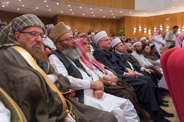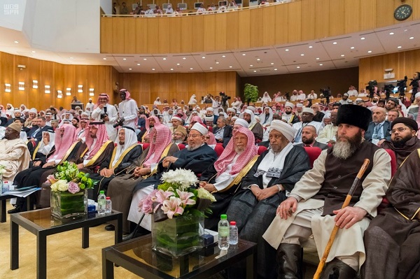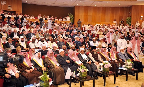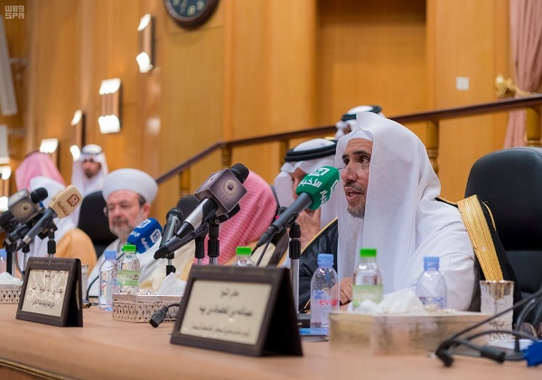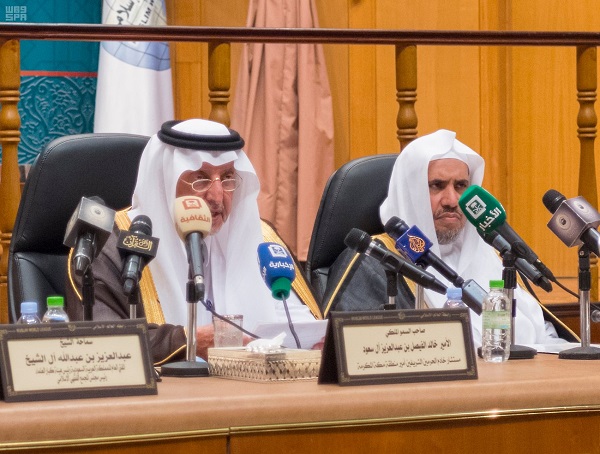 عقب ذلك ألقى سماحة مفتي عام المملكة رئيس هيئة كبار العلماء وإدارة البحوث العلمية والإفتاء رئيس المجلس الأعلى لرابطة العالم الإسلامي الشيخ عبدالعزيز بن عبدالله آل الشيخ كلمة رحب فيها بصاحب السموِّ الملكيِّ الأمير خالد الفيصل بن عبد العزيز، ومعالي الأمين العام لرابطة العالم الإسلامي الدكتور محمد بن عبدالكريم العيسى ، والحضور. وقال : نشكر رابطة العالم الإسلامي على إقامة هذا المؤتمر الذي يدل على تحسسها لمشاكل الأمة الإسلامية، وقضايا العالم الإسلامي ، وذلك من خلال إقامة مؤتمرات لمباحثة ومناقشة ما يستجد من أحداث وقضايا ومشاكل تؤرق قلب كل مسلم غيور وكل مهتم بشأن الإسلام وأهله . وأضاف سماحته قائلا : إن الإسلام جاء لهداية البشرية ، وإخراجهم من ظلمات الكفر والضلال إلى نور الإيمان والهداية إلى الصراط المستقيم ، وقد نزل الله كتابه الكريم فيه الهدى والبيان والنور والشفاء لما في الصدور، وقد تضمن هذا الكتاب الكريم بيان جميع الأحكام المتعلقة بأمور العقيدة من الإيمان بالله وكتبه ورسله والإيمان بالغيب والإيمان بالآخرة وما فيها من البعث والنشور والجزاء ثم الحياة الأبدية إما في الجنة والنعيم للمؤمنين أو في النار والجحيم للكافرين . كما بين هذا الكتاب جميع الأحكام المتعلقة بالإنسان في هذه الحياة الدنيا ، من تنظيم الأمور الشخصية للفرد ، والشؤون المتعلقة بالجماعة ، والأسرة المسلمة ، والمعاملات ، والقضاء ، والعلاقات بين أفراد المجتمع المسلم بمختلف طبقاته . وبين سماحته أن المحرمات والمعاصي التي يحرم ارتكابها وما يترتب على ذلك من عقاب في الدنيا أو عذاب في الآخرة حيث لم يترك الإسلام أمرا إلا وبين حكمه في نصوص صريحة واضحة في كتاب الله الكريم ، وسنة نبيه صلى الله عليه وسلم ببيان شاف ليس للشك فيها مجال ولا للزيع عنها مساغ ، ولا لأحد في مخالفتها عذر ولا حجة ولا برهان. وقال سماحته : والواجب عليه كذلك التسليم التام لحكم الله ورسوله وعدم مناقضته, قال تعالى: ( وما كان لمؤمن ولا مؤمنة إذا قضى الله ورسوله أمرا أن يكون لهم الخيرة من أمرهم ومن يعص الله ورسوله فقد ضلً ضلالاً مبينا)، وقال تعالى : (قل أطيعوا الله والرسول فإن تولًوا فإن الله لا يحب الكافرين) والواجب عليه كذلك إذا اشتبه عليه شيء من أمر الدين أن يرجع إلى محكماته وثوابته وأن لا يتبع المتشابه, فأتباع المتشابه من صفات الذين في قلوبهم زيغ وضلال, قال تعالى: (هو الذي أنزل عليك منه آيات محكمات هن أم الكتاب وأخر متشابهات فأما الذين في قلوبهم زيغ فيتبعون ما تشابه منه ابتغاء الفتنة و ابتغاء تاويله وما يعلم تاويله إلا الله والراسخون في العلم يقولون آمنا به كل من عند ربنا وما يذكر إلا أولو الألباب). وحذر مفتى عام المملكة المسلم من أن يجعل عقله وهواه حاكماً على ما يثبت بنص الكتاب الكريم أو ثبت في السنة النبوية المطهرة، قال تعالى: (قل إني نهيت أن أعبد الذين تدعون من دون الله قل لا أتبع أهواءكم قد ضللت إذا وما أنا من المهتدين ). حضر الحفل صاحب السمو الأمير فيصل بن محمد بن سعد وكيل إمارة منطقة مكة المكرمة المساعد للحقوق، وعدد من أصحاب المعالي ونخبة من علماء الأمة الإسلامية والباحثين و المفكرين.