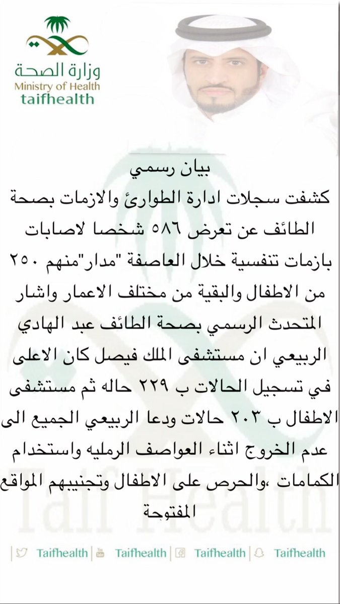 كشفت سجلات ادارة الطوارئ والازمات بصحة الطائف عن تعرض ٥٨٦ شخصا لاصابات بازمات تنفسية خلال العاصفة “مدار”منهم ٢٥٠ من الاطفال والبقية من مختلف الاعمار.