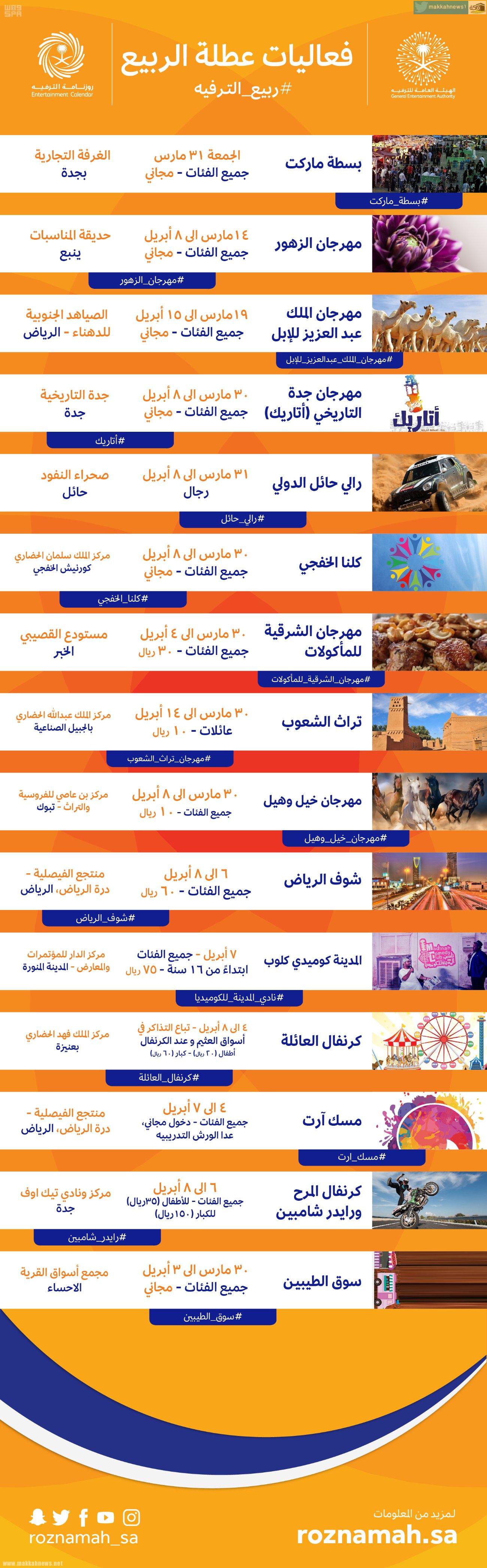 وأوضحت الهيئة أن أبرز الفعاليات التي ستستضيفها المدن السعودية خلال فترة عطلة الربيع، تتضمن (مهرجان الزهور، حديقة المناسبات بينبع (للفترة من 14 مارس – 8 أبريل 2017)، مهرجان الإبل، الصياهد الجنوبية للدهناء في الرياض (للفترة من 19 مارس – 15 أبريل 2017)، مهرجان بسطة ماركة، الغرفة التجارية بجدة (31 مارس 2017 ويستمر ليوم واحد)، مهرجان جدة التاريخي (أتاريك)، جدة التاريخية (30 مارس – 8 أبريل 2017)، رالي حائل الدولي، صحراء النفود في حائل (31 مارس – 8 أبريل 2017)، مهرجان كلنا الخفجي، مركز الملك سلمان الحضاري – كورنيش الخفجي (30 مارس – 8 أبريل 2017)، مهرجان الشرقية للمأكولات، مستودع القصيبي في الخبر (30 مارس – 4 أبريل 2017)، مهرجان شوف الرياض، منتجع الفيصلية – درة الرياض (6 أبريل – 8 أبريل 2017)، مهرجان تراث الشعوب، مركز الملك عبدالله الحضاري بالجبيل الصناعية (30 مارس – 14 أبريل 2017)، المدينة كوميدي كلوب، مركز الدار للمؤتمرات والمعارض في المدينة المنورة (7 أبريل 2017 ويستمر ليوم واحد)، كرنفال العائلة، مركز الملك فهد الحضاري بعنيزة (4 أبريل – 8 أبريل 2017)، مسك آرت، منتجع الفيصلية – درة الرياض (4 أبريل – 7 أبريل 2017)، رايدر شامبين، مركز ونادي تيك اوف بجدة (6 أبريل – 8 أبريل 2017)، مهرجان خيل وهيل، مركز بن عاصي للفروسية والتراث بتبوك (30 مارس – 8 أبريل 2017)، مهرجان سوق الطيبين، مجمع أسواق القرية في الأحساء (30 مارس – 3 أبريل 2017).
