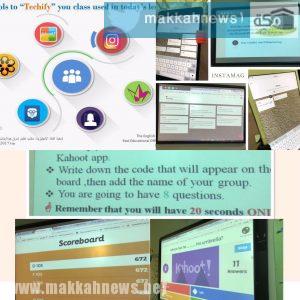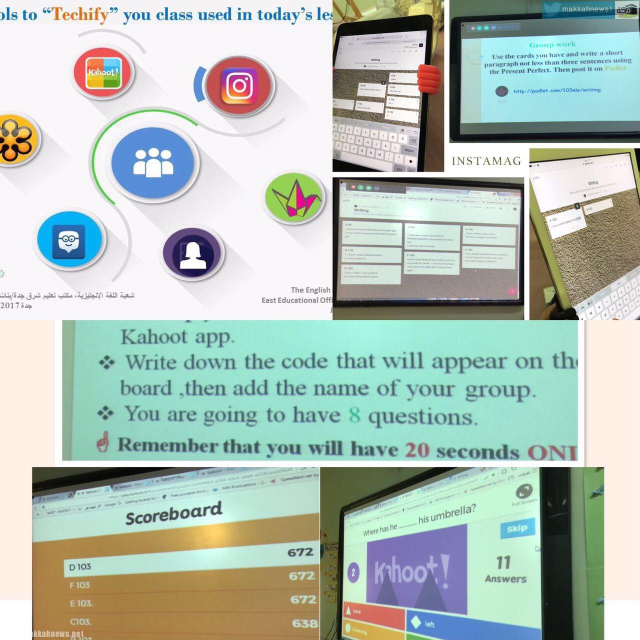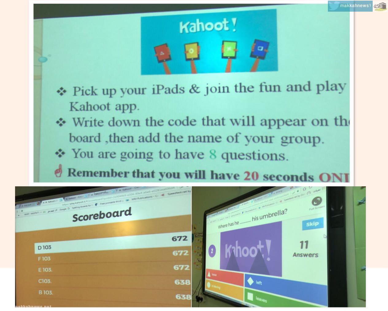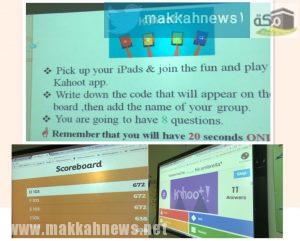كما استخدمتا للتمارين التطبيقيةتطبيق ” كاهوت ” و تطبيق “بادلت” الحائط الالكتروني والذي تكّون فيه الطالبة جملة او سؤال و وثم تقوم بلصقها في الحائط عن طريق الايباد.