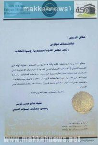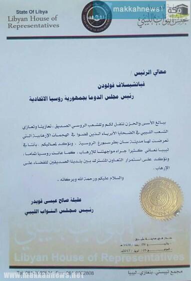 قدم فخامة رئيس مجلس النواب المستشار عقيلة صالح تعازيه الحارة إلى رئيس مجلس الدوما في جمهورية روسيا الاتحادية فياتشيسلاف فولودن .