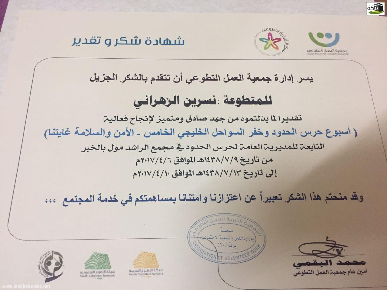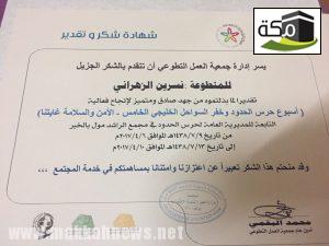كذلك تقدمت “جمعية العمل التطوعي” بالشكر الجزيل للمتطوعة “نسرين الزهراني” واعتزازهم وامتنانهم بمساهمتها في خدمة المجتمع.