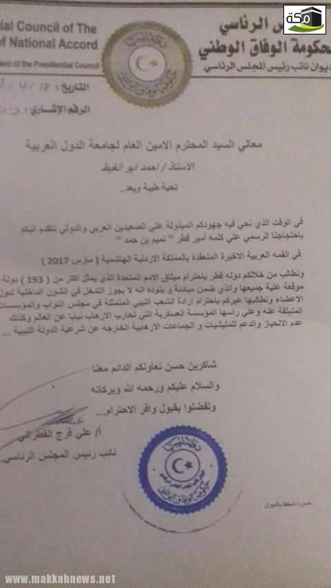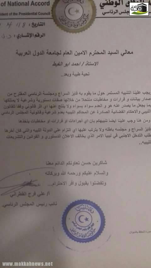 وسلم سيادة النائب كتاب رسمياً للأمين العام لجامعة الدول العربية بعدم الانجرار وراء هذه الأفعال التي تساهم في مزيد من الانقسام والتوثر بالمشهد السياسي الليبي وتدعو إلى المزيد من الفتنه والتحريض وإراقة الدماء ما بين أبناء شعبي الكريم.