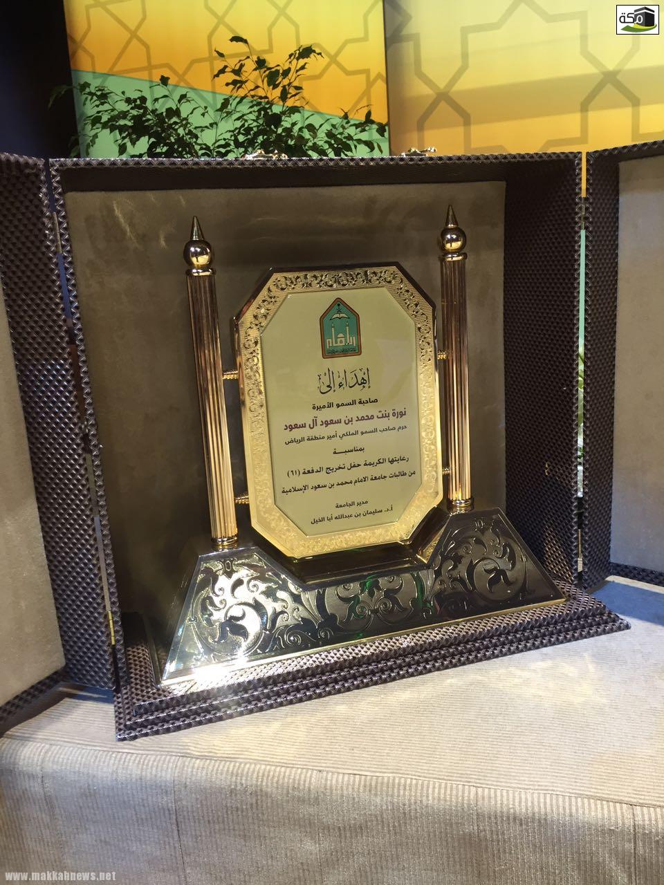 رعت حرم أمير منطقة الرياض صاحبة السمو الأميرة نورة بنت محمد آل سعود مساء أمس حفل تخريج طالبات جامعة الإمام محمد بن سعود الإسلامية الدفعة (الحادية والستين) من حملة الدكتوراة والماجستير والبكالوريس والدبلوم والتعليم عن بعد للعام الجامعي 1437/1438هـ في مبنى المؤتمرات بالمدينة الجامعية.