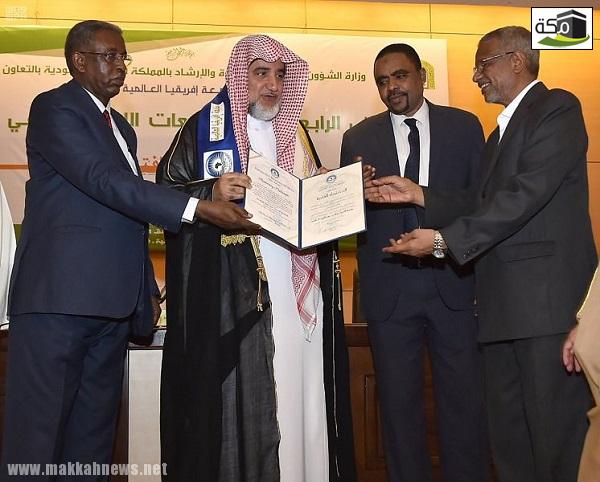 أصدر المجلس العلمي بجامعة أفريقيا العالمية بجمهورية السودان قراراً بمنح درجة الدكتوراه الفخرية في الدراسات الإسلامية, لمعالي وزير الشؤون الإسلامية والدعوة والإرشاد الشيخ صالح بن عبدالعزيز بن مـحمـد آل الشيخ اعترافاً بإسهاماته الكبيرة والمُقَدرة في العمل الدعوي والإسلامي في أفريقيا، وتقديراً وعرفاناً من الجامعة بدوره البارز في الإسهام في تفعيل رسالة الجامعة، وتحقيق رسالتها في نشر العلم تجاه أفريقيا والعالم.